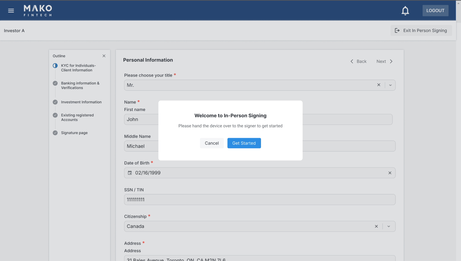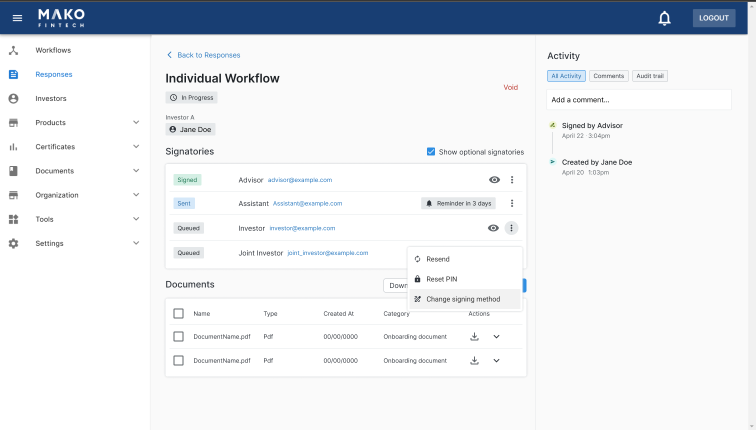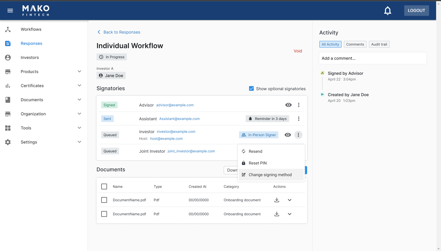 Using Mako's In-Person Signing feature, Advisors can review and sign documents with Investors in person, seamlessly.